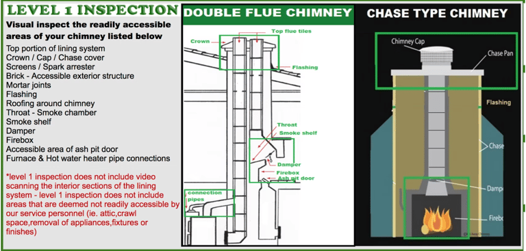 This inspection is recommended when the chimney and venting system is easily accessible and when the homeowner is planning to maintain its current use. In general, this level of inspection is performed in most homes. In a Level I inspection a professional chimney sweep verifies that the chimney structure is sound and that the chimney is free of obstructions and combustible deposits, such as creosote.Level one inspection is preformed on every chimney / fireplace cleaning that Chimney depot does.